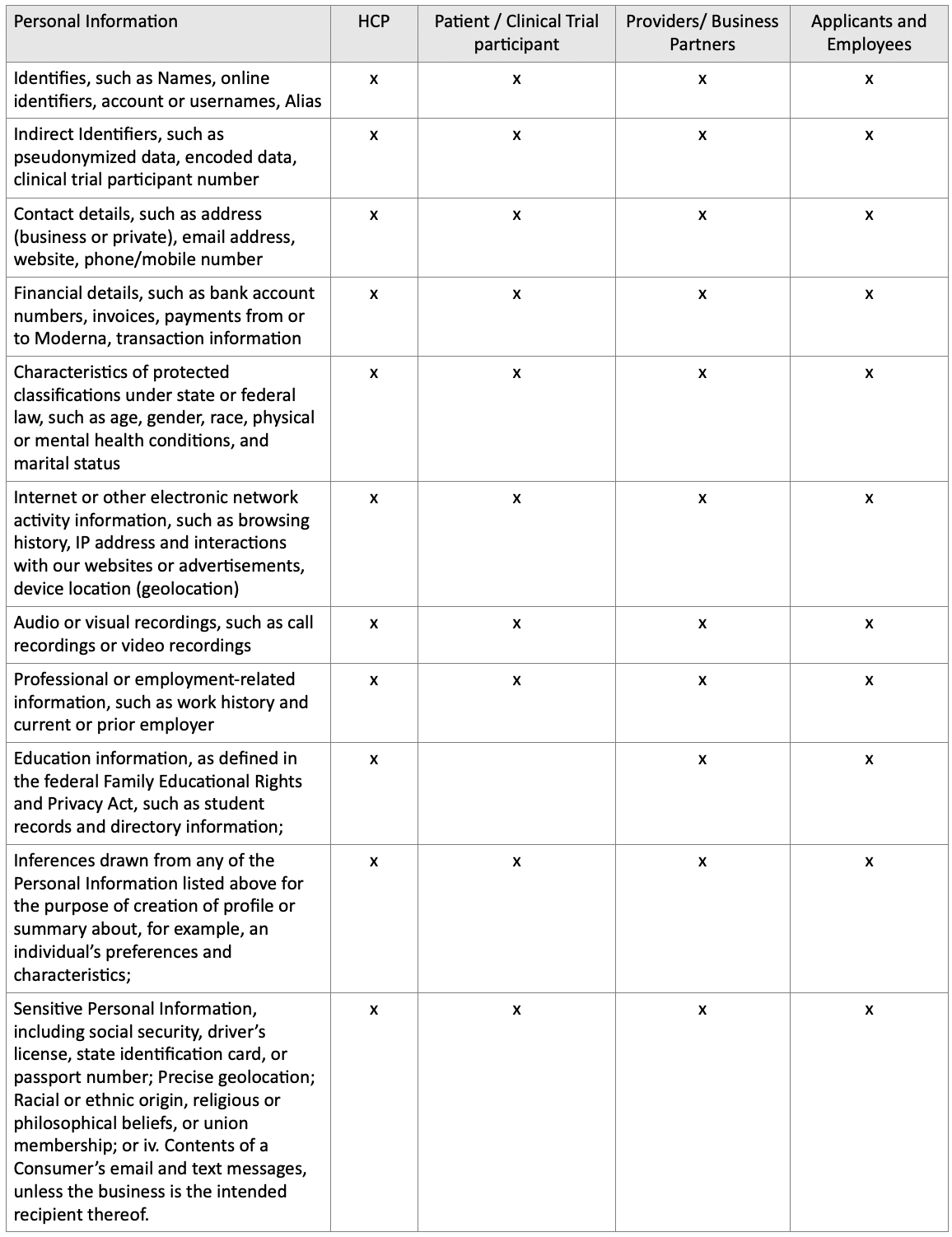 Contratistas: Si es un contratista que presta servicios para Moderna y desea información sobre las categorías de datos personales que recopilamos de usted como contratista y el propósito para el cual se utilizarán los datos personales, visite nuestra página web de solicitar.