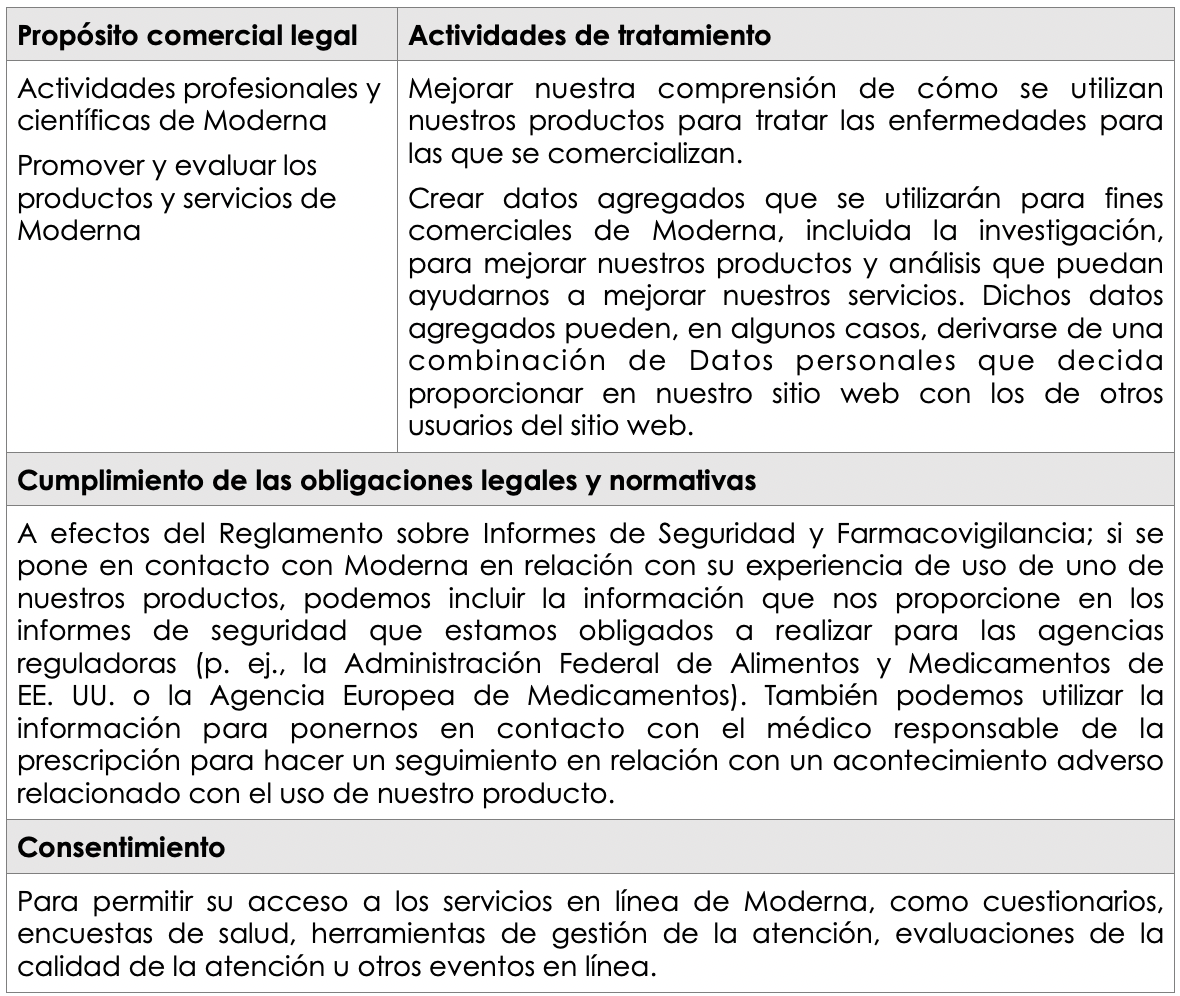 Moderna trata sus Datos personales para cumplir con las obligaciones legales en virtud de las leyes y normativas de farmacovigilancia aplicables en todo el mundo y, cuando sea necesario, para nuestros intereses legítimos de garantizar las normas de farmacovigilancia adecuadas.